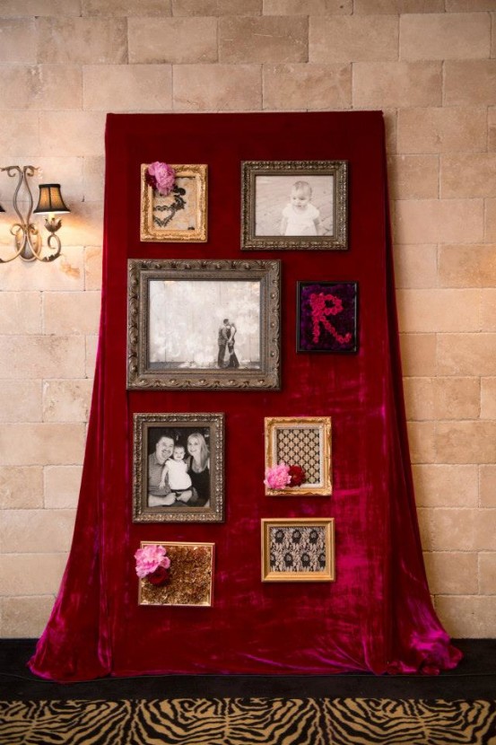 Custom gallery wall for their ceremony held in the Hemingway Room. Featuring their favorite photos of each other and their daughter G.