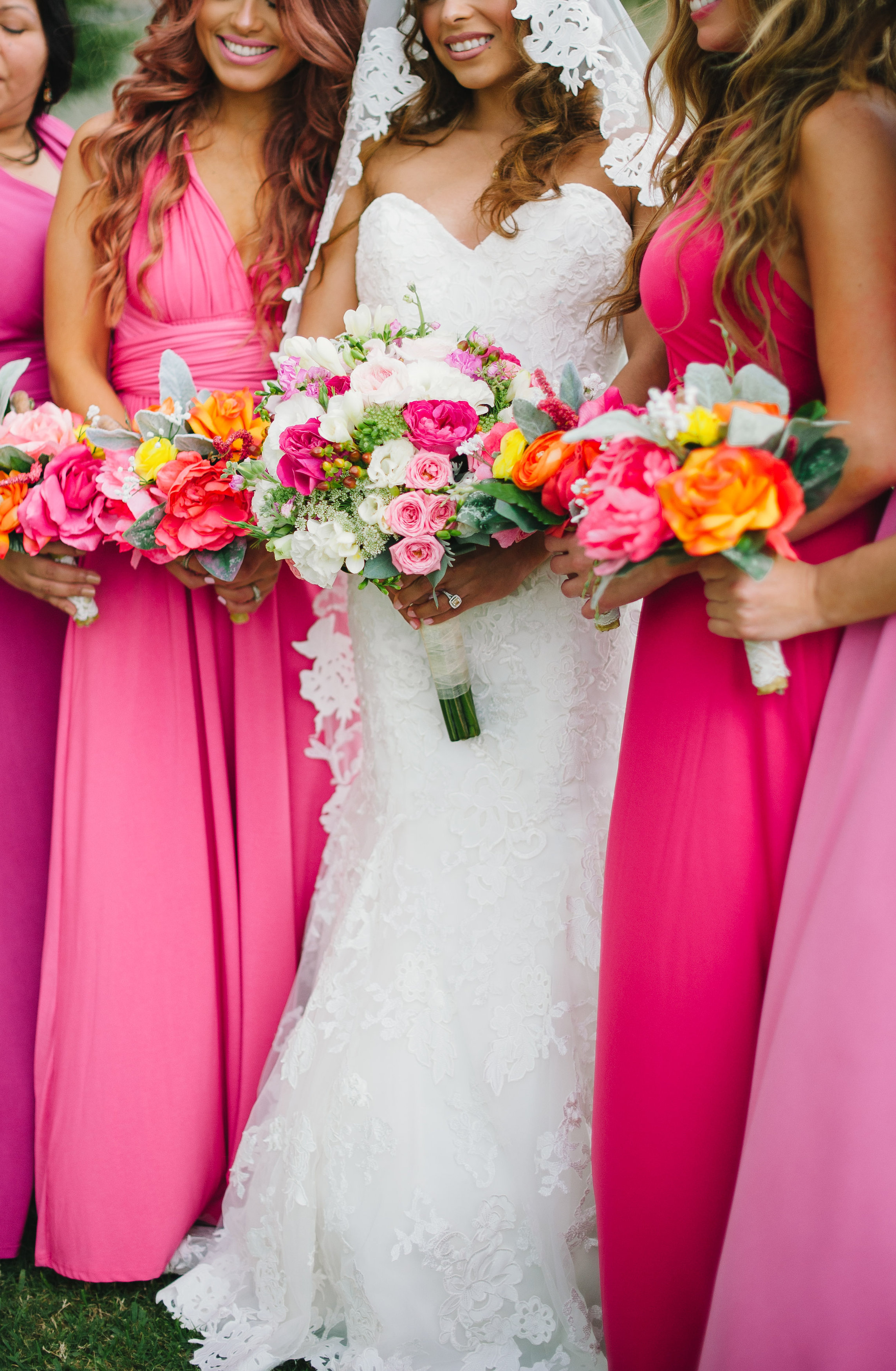 The architectural columns of the ceremony location caught Francisca’s eye from the beginning. Since the columns made a statement of their own, we decided to incorporate a simple garland of greenery and pops of bright, lush florals to soften the overall look. The floral designs, which were created by the venue, were a large part of incorporating the Spanish element. The use of vivid colors such as yellow, orange and pink, captured the overall essence of the rich Mexican culture.